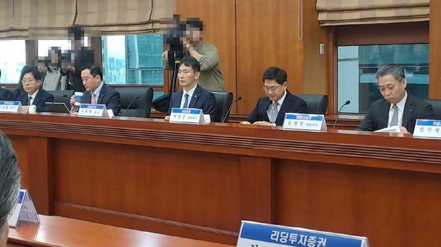 이복현 금융감독원장(왼쪽에서 세번째)이 5일 서울 여의도 소재 금융투자협회 대회의실에서 24개 증권회사 CEO와 진행한 간담회에서 모두발언 하고 있다. = 박진우 기자