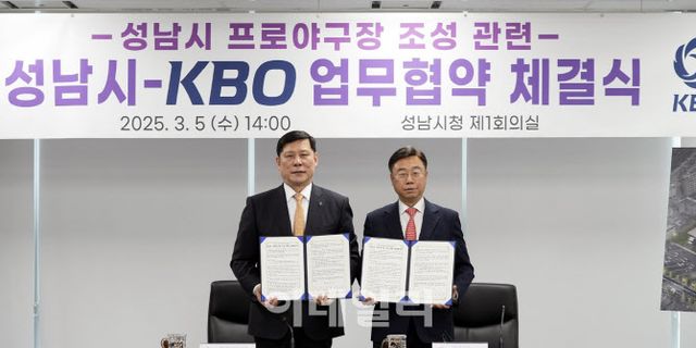 5일 신상진 성남시장과 허구연 한국야구위원회(KBO) 총재는 성남시청 제1회의실에서 ‘야구전용구장 건립을 위한 업무협약(MOU)’을 맺었다.