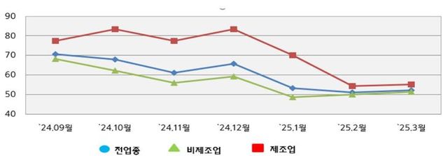 중소기업중앙회 제주지역본부가 지난 2월 12일부터 18일까지 도내 45개 중소기업을 대상으로 '2025년 3월 중소기업경기전망조사'를 실시한 결과 업황전망 중소기업건강도지수(SBHI)는 52.2로 전월대비 1.1p 증가한 것으로 조사됐다. 두 달 만에 소폭 반등했는데, 50대를 벗어나지 못하고 있다. 제주지역 SBHI는 지난해 9월 70.5에서 10월 67.8로 하락한 뒤 3개월간 60대에 머물다 올해 1월 53.3으로 떨어진데 이어 2월 51.1로 더 떨어졌다.