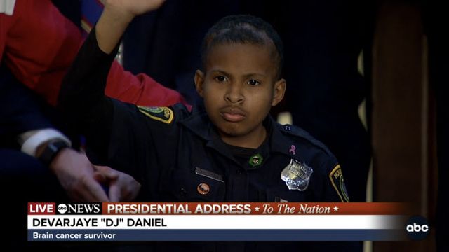 트럼프 대통령은 또 뇌암 투병중인 13세 소년 DJ 대니얼을 초청해 비밀경호국 명예 요원으로 임명했다. 트럼프 대통령은 그를 “항상 경찰관이 되는 것을 꿈꾸고 있는 소년”이라고 소개했다. 두 사람은 관중들의 뜨거운 박수와 환호를 받았다.
