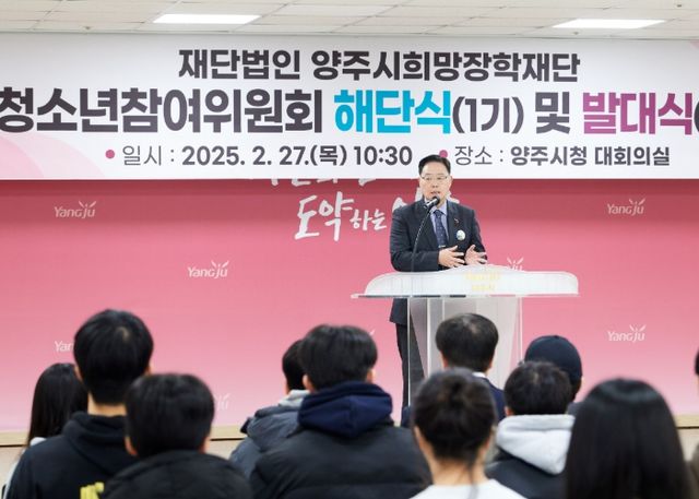 [파이낸셜경제=김영란 기자] 강수현 양주시장이 최근 시청 대회의실에서 ‘양주시희망장학재단’이 주관한 ‘2025년도 청소년참여위원회 해단식 및 발대식’에 참석해 위원들의 적극적인 참여와 노력을 격려하고 앞으로의 활동을 응원했다.