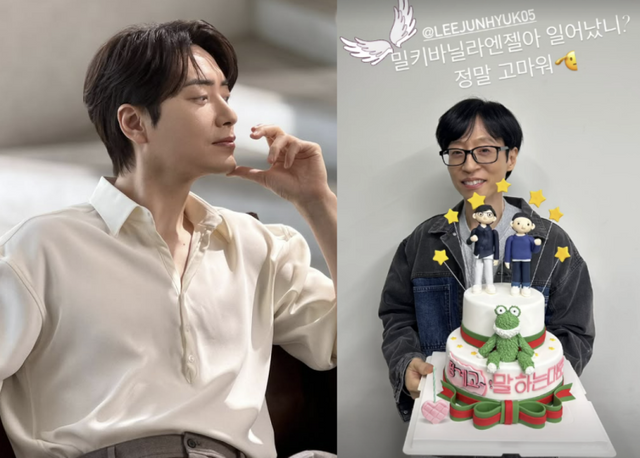 또 다른 사진에선 유재석이 주문 제작 케이크를 들고 미소짓고 있다. 이준혁 계정을 태그해 “밀키바닐라엔젤아 일어났니? 정말 고마워”라고 적혀 눈길을 끈다.