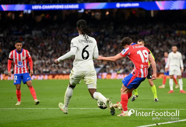 아틀레티코도 ‘원더골’로 응수했다. 전반 32분 알바레즈가 페널티 박스 왼쪽에서 기습적으로 감아 찬 슈팅이 아름다운 궤적을 그리며 그대로 레알 골문으로 빨려 들어갔다. 엄청난 원더골로 승부의 균형을 맞췄다.