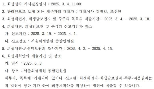 또한 회생채권, 회생담보권 및 주식 신고기간이 오는 19일부터 다음달 1일까지다. 홈플러스가 채권자 목록을 제출하면 목록에 기재된 회생채권, 회생담보권, 주주·출자지분은 신고기간 안에 신고된 것으로 의제된다.