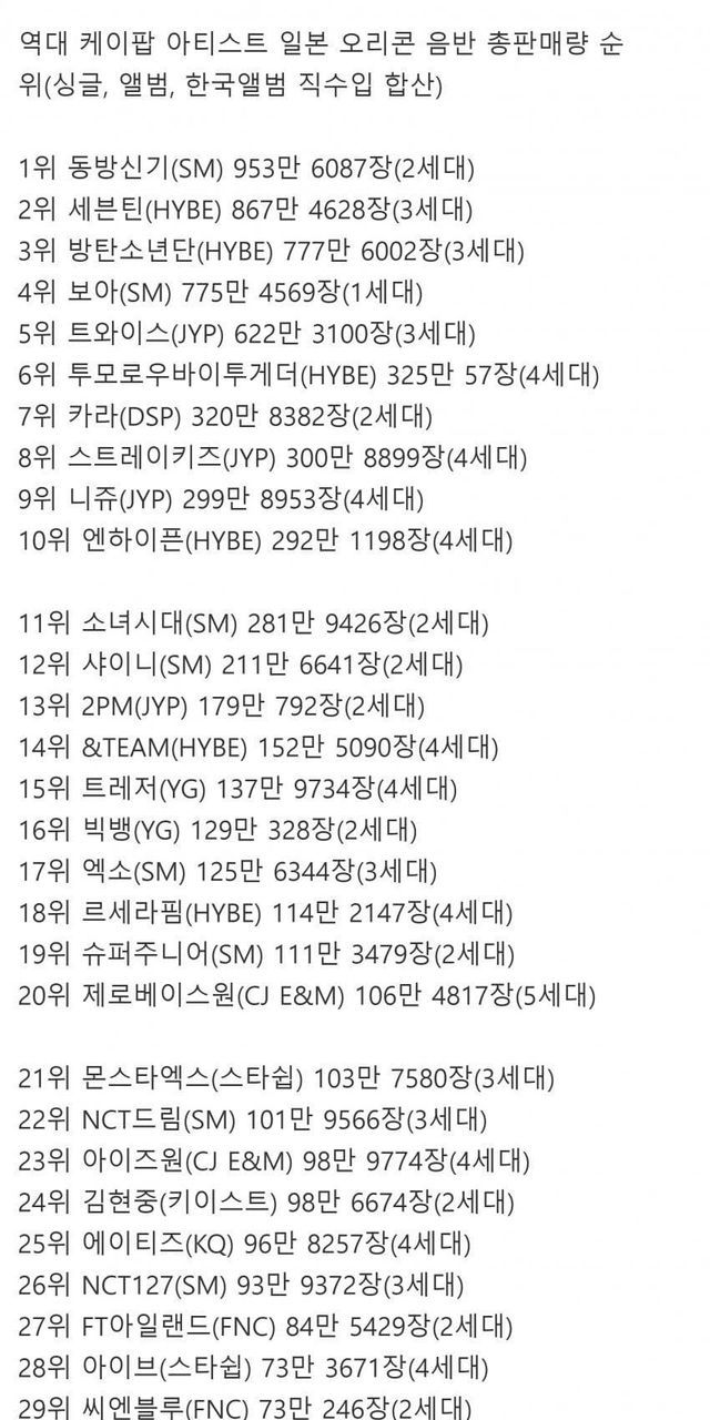 역대 일본에서 음반이 가장 많이 팔린 한국가수 순위