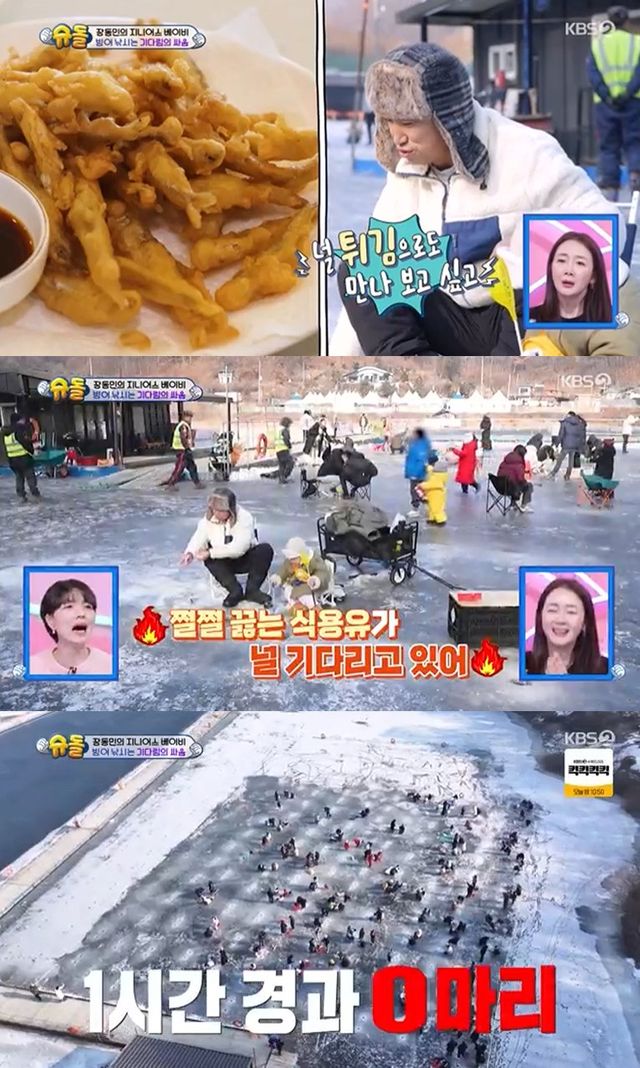 장동민의 이런 발언을 들었는지 빙어 낚시를 하며 빙어가 잡히길 기다리지만, 1시간이 지나도록 입질이 오지 않았다. 이에 장동민과 지우는 빙판을 돌아다니며 사람들에게 비법을 물었다.