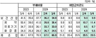 보건산업 제조업체의 재무 안정성을 나타내는 부채비율은 34.8%로 직전 분기(36.2%) 대비 소폭 개선됐다. 차입금의존도는 9.9%로 직전 분기(9.3%)와 비슷한 수준을 유지했다.