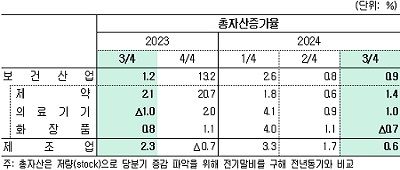 보건산업 제조업체의 총자산증가율은 0.9%로 전년 동분기(1.2%) 대비 소폭 감소했다.