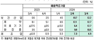 보건산업 제조업체의 3/4분기 매출액증가율은 12.2%로 2/4분기(10.7%) 대비 1.5%p 상승했다.