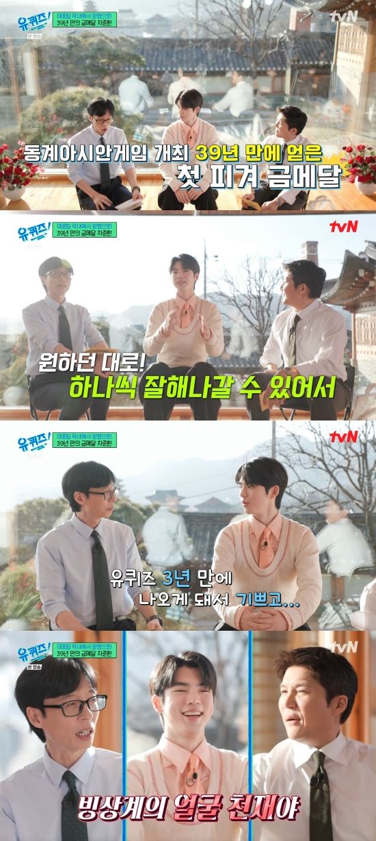 유재석은 "동계아시안게임 개최된 지 39년 만에 얻은 첫 피겨 금메달이다"라며 기뻐했고,. 차준환 선수는 "최근에 경기들이 많았다. 그 사이에서도 늘 제가 원하는 대로 하나씩 잘 해나갈 수 있었던 것 같다. 제가 준비한 만큼 다 한 거 같고 '유퀴즈' 3년 만에 나오게 돼서 기쁘다. 저의 성장 서사를 볼 수 있는 기회인 것 같아서 좋은 거 같다"라며 전했다.