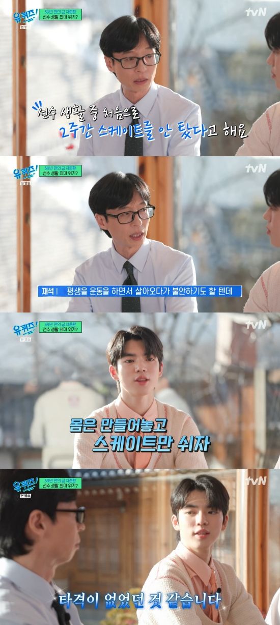 또 유재석은 "선수 생활 15년 만에 처음으로 2주간 스케이트를 안 탔다고 한다. 이렇게 쉬어본 적이 처음이라더라"라며 궁금해했고, 차준환 선수는 "스케이트를 아예 안 신는 게 방법인 거 같아서 자극을 최대한 줄이려고 작년에 쉬어봤다"라며 고백했다.