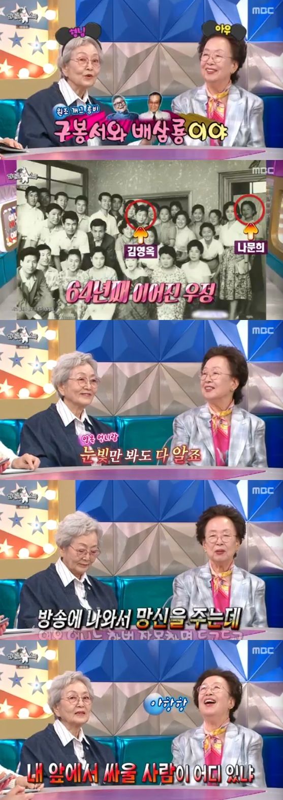 김영옥과 무려 64년째 우정을 이어오고 있는 나문희는 "영옥 언니와는 눈빛만 봐도 안다. 근데 한 번 잘못하면 두고두고 망신을 준다. 그런데 친하지 않으면 그렇게 못한다. 그래도 크게 싸운 적은 없다"면서 표정 하나 변하지 않고 디스(?)를 했다.