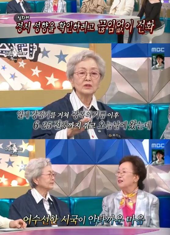 나문희의 말에 김영옥은 "나도 너랑 친하다고 나한테도 좌파라고 하더라. 우리는 좌파, 우파 이런거 잘 모른다. 그냥 나라가 어수선한게 너무 슬플 뿐이다. 일제강점기를 거쳐서 해방의 기쁨, 6. 25까지 다 겪고 여기까지 왔는데 너무 슬프다"고 말해 눈길을 끌었다.