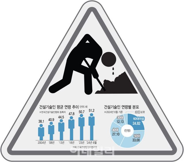 건설 기술인의 고령화도 수순이다. 한국건설기술인협회에 등록된 건설 기술인의 평균 연령은 지난해 6월 기준 51.2세로, 2010년(45세)보다 6.2세 늘어난 마당이다. 이에 따라 전체 건설 기술인 중 11% 가량을 차지하던 50~60대 비율은 지난해 무려 57%로 증가했다.