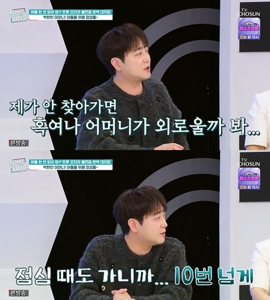 박현빈은 "아내 음식도 잘 먹는데 엄마 밥이 생각이 날 때가 있다"며 "제가 안 찾아가면 외롭고 섭섭해하지 않으실까"라고 덧붙였다.