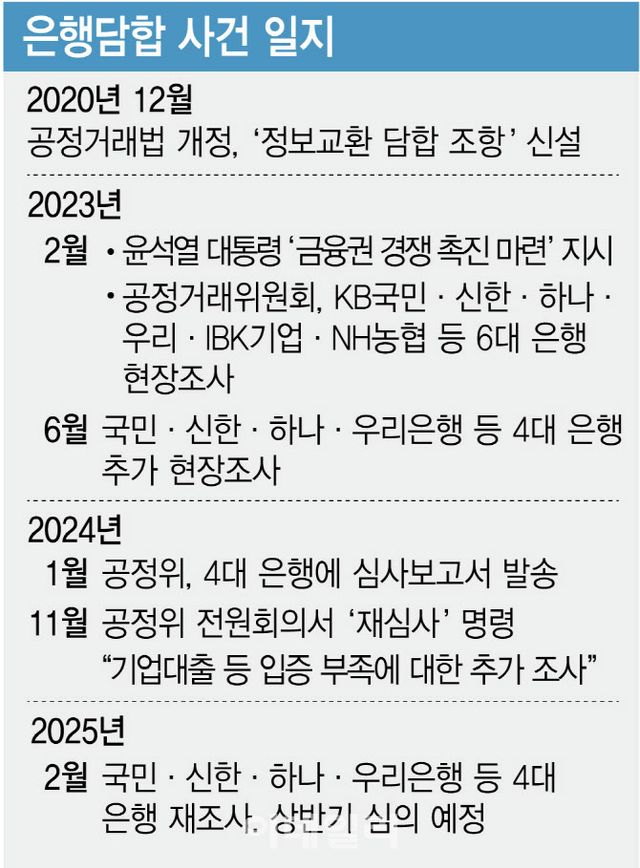 공정위는 앞서 2023년 2월 윤석열 대통령이 ‘금융권 경쟁 촉진 마련’을 지시한 직후 KB국민·신한·하나·우리·IBK기업·NH농협 등 6대 은행에 대한 현장조사 벌여 대출 업무 관련 자료를 확보했다. 이어 6월에는 국민·신한·하나·우리은행 등 4대 은행에 대한 추가 현장 조사를 진행한 후 11월 심의했고 재심사 결정이 났다.