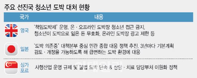 특히 영국은 ‘책임도박제’를 운영하고 있는데 이를 통해 청소년들이 불법 도박에 접근하는 것을 원천 차단하고 있다. 책임도박제의 주요 원칙은 △온·오프라인 도박장 청소년 접근 금지 △온라인 도박사이트 언령허가제(문제 발생시 사행업자가 책임) △청소년이 도박으로 잃은 돈 무효화 △온라인 도박장 광고 제한 △아동·청소년 관련 원칙 위반시 사행행위 면허 박탈 등이다. 청소년이 아닌 사행업자에게 불법 도박 등에 대한 책임을 물어 사업자들이 자발적으로 청소년들의 접근을 막는 방식을 선택하도록 하는 구조다.
