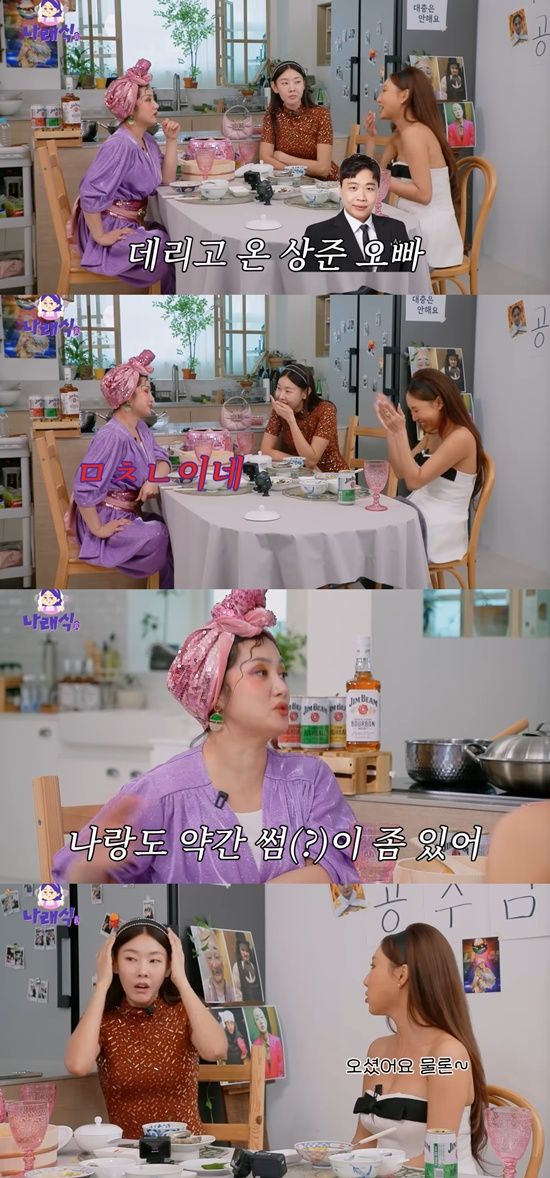 화사는 "저번에 한 번 프로그램에서 (양)세찬 오빠가 소개해주겠다고 상준 오빠를 데려왔다"고 말을 꺼냈다. 이에 박나래는 "미친X이네"라고 격하게 반응하면서, "상준 오빠는 나랑도 약간 썸이 좀 있다"고 족보가 꼬일뻔한 상황에 불편한 심기를 드러내 웃음을 안겼다.