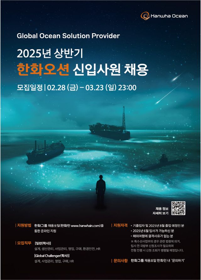 한화오션 관계자는 “방산·친환경·해상풍력·스마트야드 등 4대 축을 중심으로 ‘글로벌 오션 솔루션 프로바이더’ 달성을 위해 앞으로도 다양한 투자와 대규모 우수 인재 확보를 지속적으로 진행할 예정”이라고 밝혔다.