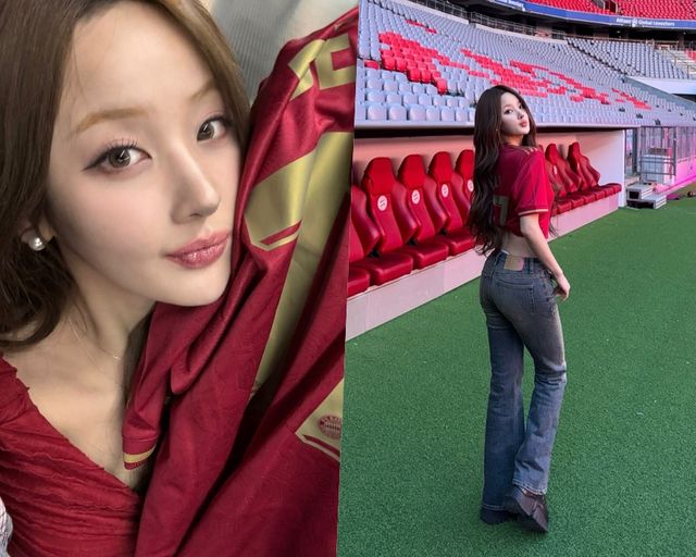 벨은 한 스테디움에서 청바지에 강렬한 레드 티셔츠를 크롭탑으로 연출한 뒤 다양한 포즈를 취하고 있다. 이에 벨의 잘록한 허리와 골반라인이 드러나며 아름다움에 감탄을 더한다.