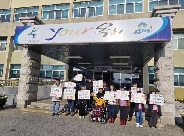 | ▲ 자립생활센터 이용자들이 옥천군 사업추진을 응원하는 모습 |