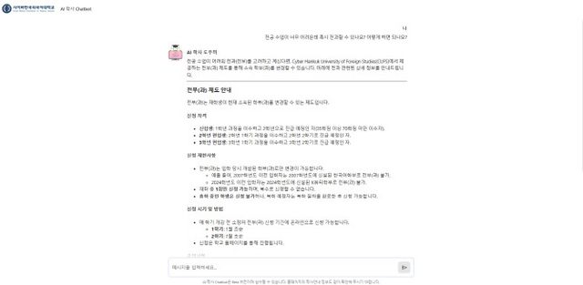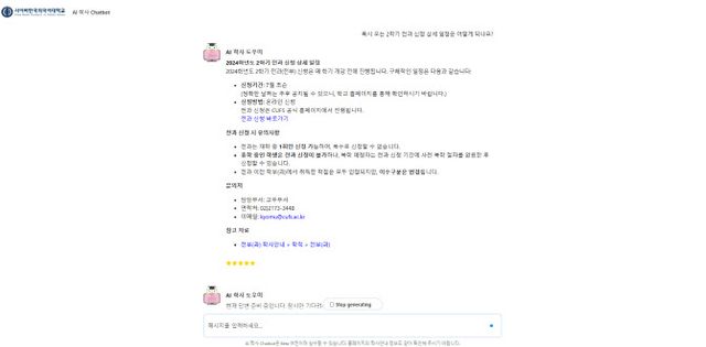 학사 및 입시 시즌마다 반복되는 문의 사항을 신속하고 정확하게 처리할 수 있도록 학사/입시 챗봇도 함께 구축되었다. 이 챗봇은 학사 일정, 입학 절차, 등록, 수업 관련 문의 등에 대해 24시간 실시간 답변을 제공하며, 기존의 수작업 응대 업무를 대폭 줄여 행정 부서의 업무 효율성을 극대화했다. 이를 통해 학생들은 언제든지 필요한 정보를 실시간으로 얻을 수 있고, 행정 부서는 보다 중요한 업무에 집중할 수 있게 되었다.