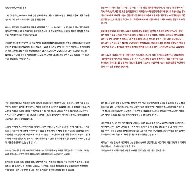 끝으로 NJZ 부모 측은 "저희는 가처분 및 향후 예정되어 있는 본안 소송에도 성실히 임할 예정이며, 재판 과정에서 해지의 적법성을 다시 한번 확인받고자 한다"라며 "다시는 누구도 저희와 같은 부당한 사례를 겪지 않길 바란다"라며 글을 마쳤다.