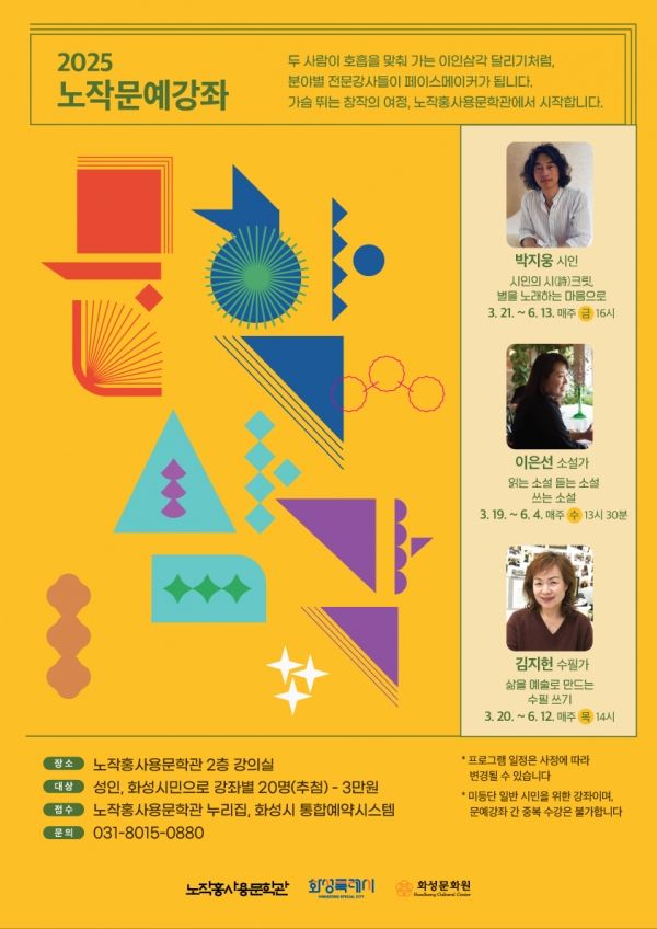 노작문예강좌 <문학삼각>의 참여 대상은 미등단 성인 시민으로, 중복 수강은 불가하다. 올해는 추첨 방식으로 수강생을 선발할 계획으로, 참가비용은 3만원이다. 수강 신청은 3월 7일부터 14일까지 화성시 통합예약시스템에서 접수받는다.