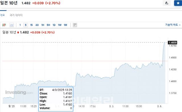 이날 미국과 유럽의 국채금리 상승도 일본 채권시장에 영향을 미쳤다. 지난 4일(현지시간) 재정준칙 완화를 발표한 독일의 장기국채 금리는 2.8%로 20년만에 최대치를 기록했고, 미국도 트럼프 행정부의 관세 압박 등에 따른 인플레이션 우려로 장기국채 금리가 상승했다.