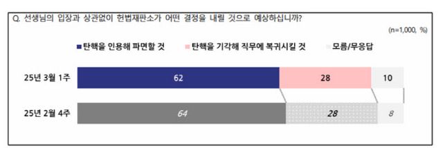6일 발표된 전국지표조사(NBS)에 따르면 ‘윤석열 대통령 탄핵이 인용될 것’이라고 예상한 응답 비율은 62%였다. 반면 ‘기각해 직무에 복귀할 것’이라는 응답 비율은 28%였다.