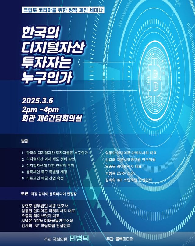 세미나에서는 20·30세대의 디지털 자산에 대한 관심과 투자 동향, 이를 뒷받침할 제도적 개선 방안이 주요 논의사항으로 다뤄진다.