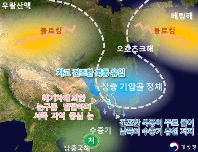 (잦은 눈) 차고 건조한 북풍이 우리나라로 자주 불어 강수량은 적었으나, 대륙고기압 확장과 상층 찬 기압골 영향으로 서해상에서 해기차(바닷물과 대기의 온도 차)에 의해 발달한 눈구름이 유입되어 서쪽 지역을 중심으로 눈이 자주 내렸다. 전국 눈일수는 21.9일로 평년보다 6.0일 많았지만(역대 4위), 내린 눈의 양은 27.4 cm로 평년(25.9 cm)과 비슷했다.