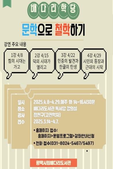 [와이뉴스] 평택시립 배다리도서관은 오는 4월 8일부터 매주 화요일 오후 2시 정천구 고전학자의 ‘문학으로 철학하기’를 주제로 총 4회에 걸쳐 특강을 진행한다.