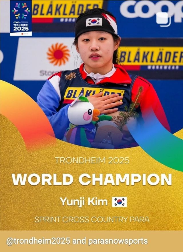 김윤지는 5일(현지시간) 노르웨이에서 열린 '2025 국제스키연맹(FIS) 노르딕스키 세계선수권대회' 파라(장애인) 크로스컨트리 여자 1㎞ 클래식종목에서 3분04초35의 기록으로 가장 먼저 결승선을 통과했다. 2위 켄달 그레취(미국)과 2초99 빨리 결승선에 들어와 금메달을 획득했다.