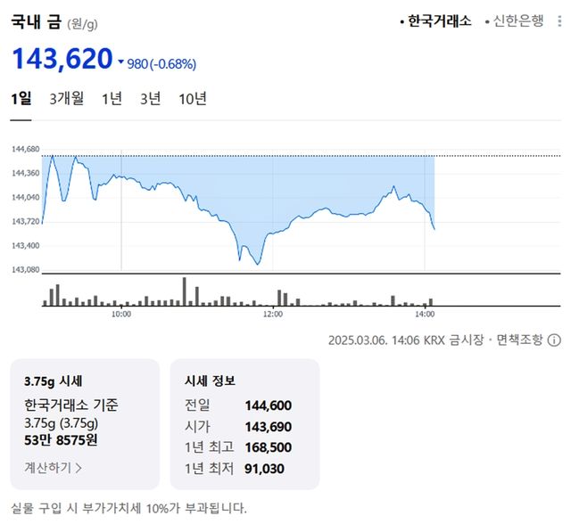 국내 금시세(금값)가 6일(한국 시각) 오후 하락세(전 거래일 대비)를 보이고 있다.