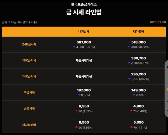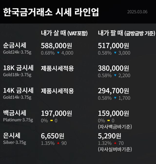 순금(24K) : 매입가 58만 8000원 / 매도가 51만 700원