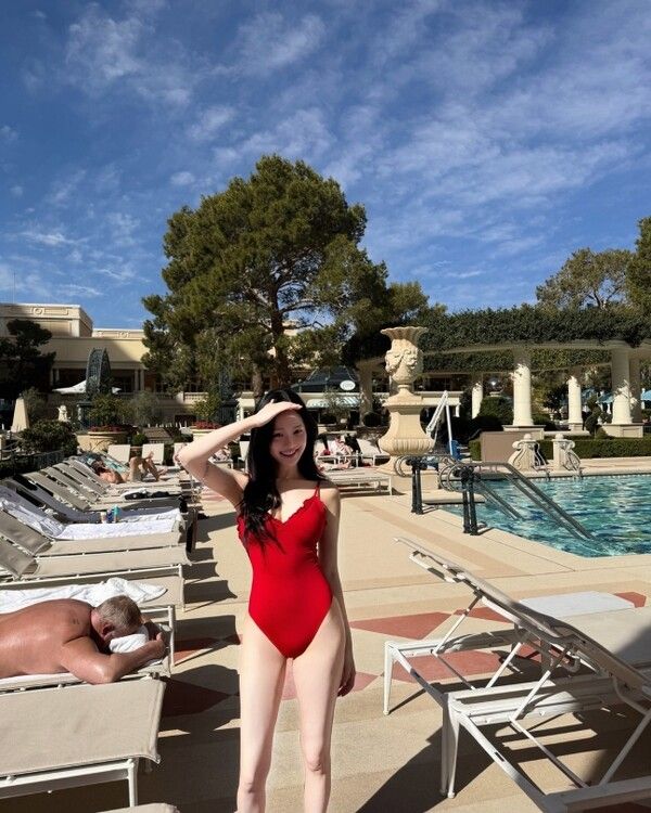 미국 라스베이거스 여행 중인 이유비는 수영장에서 여유로운 시간을 보내는 모습이다. 빨간색 수영복을 입은 그는 과하지 않은 노출에도 불구하고 건강미 넘치는 매력을 뽐냈다.