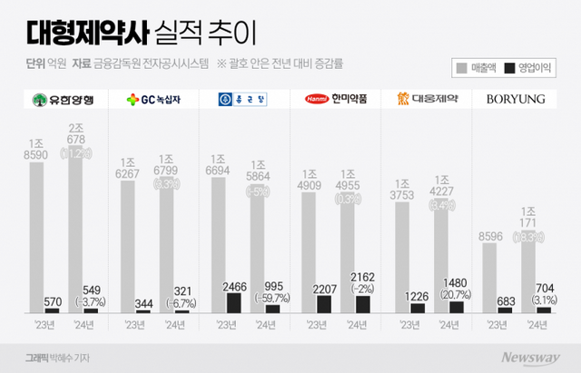 6일 국내 매출 1조원 이상 제약사 6곳(유한양행·GC녹십자·종근당·한미약품·대웅제약·보령)의 작년 실적을 분석한 결과, 종근당을 제외한 모든 기업의 매출은 증가했다. 연구개발(R&D) 비용 증가와 기저 효과 등으로 인해 대부분 수익성은 아쉬운 모습을 보였다.