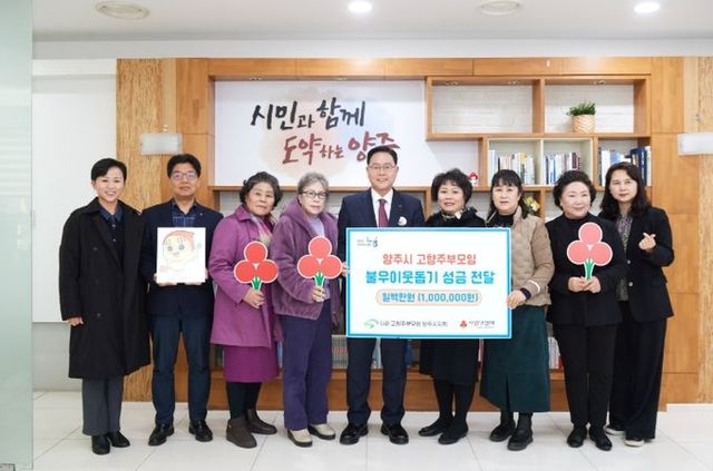 강수현 양주시장은 “주변의 이웃을 생각하는 고향주부모임의 따스한 마음에 깊이 감사드린다”며 “소중한 성금이 저소득 취약계층의 새로운 변화와 성장을 도모하는 원동력이 되도록 잘 전달하겠다”고 말했다.