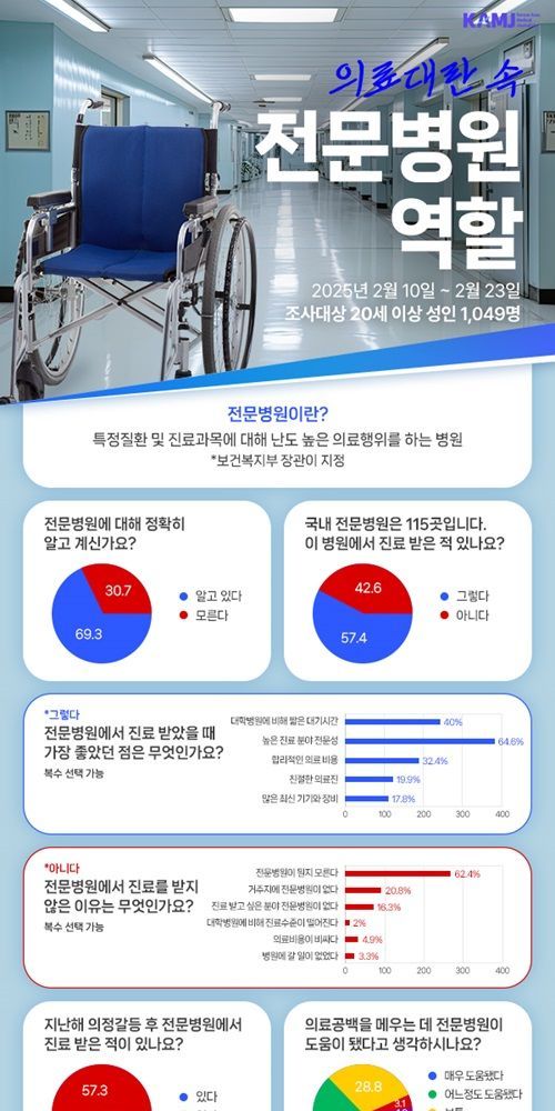 또 의료공백 후 현명한 병원 이용이 강조되고 있는 가운데 응답자의 66.9%는 전문병원이 의료공백을 메우는 데 도움이 됐다고 답했으며 지난해 의정갈등 사태 후 전문병원 진료경험이 있는 환자는 42.7%였다.