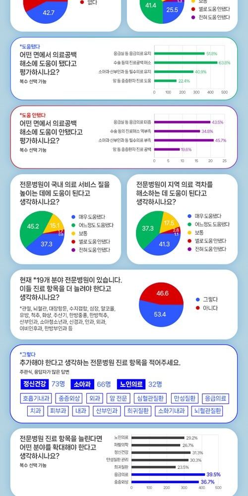 또 ‘현재 19개 분야의 전문병원에서 진료항목을 더 늘려야 한다고 생각하는가’라는 질문에 53.4%가 ‘그렇다’고 답해 절반 이상이 진료항목 확대에 공감했다. 추가해야 하는 진료항목으로는 ‘정신건강(73명)’ ‘소아과(66명)’ ‘노인의료(32명)’ 등이 꼽혔다.
