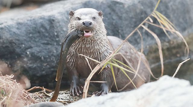 수달 한 마리가 먹이활동을 하며 사냥한 메기를 입에 물고 있다. 기사 이해를 돕기 위한 자료 사진 / 함양군 제공-뉴스1