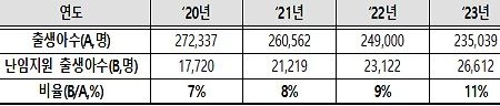 정부의 지속적인 난임부부 지원 확대로 전체 출생아 중 난임시술 지원으로 태어난 출생아 수의 비율은 2020년 7%, 2021년 8%, 2022년 9%, 2023년 11%로 지속적인 증가 추세를 보이고 있다.