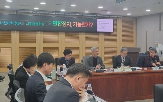 기조 발제를 맡은 안병진 경희대 미래문명원 교수는 “내란 세력 청산과 사회대개혁 과제를 위해 ‘민주헌정주의 연합정치’ 추진하자”고 제안했다. 그러면서 연합정치는 ▲‘사회대개혁 위원회’ 설치 ▲결선투표제 도입 ▲대선 후 연합정치 지속 방안 등 3가지 정치협약을 중심으로 선거 캠페인과 국정운영을 수행해야 한다고 밝혔다.