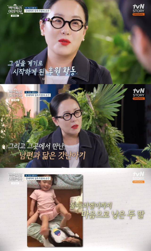그 뒤로 그는 한국에 돌아와서 17년째 아프리카 아이들을 후원하고 있다고 설명했다. 이후 남편과 신생아 돌보기 활동에도 참여했는데, 그곳에서 남편과 매우 닮은 첫째 아인이를 만나게 됐다고 말했다.