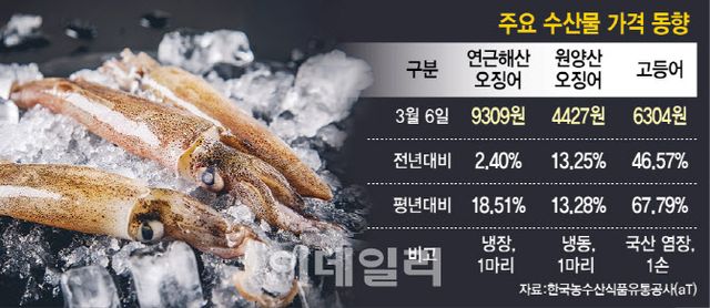 문제는 국내산을 대체해온 원양산 오징어의 가격도 오르는 추세라는 점이다. 6일 기준 원양산 냉동 오징어 1마리 가격은 4427원으로, 국내산의 반값 수준이지만 1년 전에 비해 13.25%가 뛰었다.