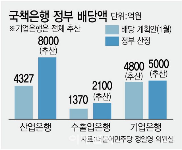 한국수출입은행은 배당가능이익 8071억원 중 정부 배당금을 1370억원으로 제출했으나 배당성향 35%를 적용하면 올해 정부 배당액은 약 2100억원 전후로 결정될 것으로 보인다. IBK기업은행은 공시위반을 이유로 배당가능이익과 배당성향 정보를 밝히지 않았지만 산은과 수은에 빗대어보면 정부 배당금은 4800억원 전후로 예상한다. 금융노조는 성명문을 통해 기재부가 기업은행에 주당 1065원의 배당을 결정해 약 5000억원을 가져가리라 주장한다. 산은과 수은, 기은 3개 국책은행의 배당금을 모두 합하면 올해 정부가 가져가는 배당액은 약 1조 5000억원에 이를 것으로 보인다. 3개 국책은행이 배당성향 산정 기초자료를 통해 밝힌 1조 500억원과 비교해 4500억원이나 더 많은 금액이다.