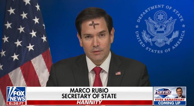 루비오 장관은 6일(현지시간) 미국 폭스뉴스의 대담 프로그램 ‘해너티’와 인터뷰를 가졌다. 해너티는 트럼프 비공식 자문을 맡기도 했던 유명한 보수 성향 방송인 숀 해너티가 진행하는 프로그램이다. 해너티한테서 우크라이나-러시아 전쟁과 관련한 질문을 받은 루비오 장관은 이마에 재로 그린 십자가 모양이 선명한 모습이었다.
