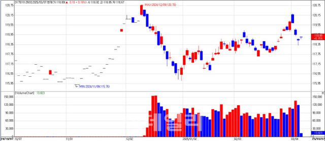 엠피닥터에 따르면 이날 오전 9시50분 기준 3년 국채선물(KTB3)은 전거래일 대비 8틱 오른 106.79를, 10년 국채선물(KTB10)은 28틱 오른 119.90을 기록 중이다. 30년 국채선물(KTB30)은 34틱 상승한 149.50을 나타내고 있으며 거래는 10계약이 체결됐다. 틱은 국채선물 가격 산정 단위로 틱이 오르면 국채 선물 가격 상승을 의미한다.