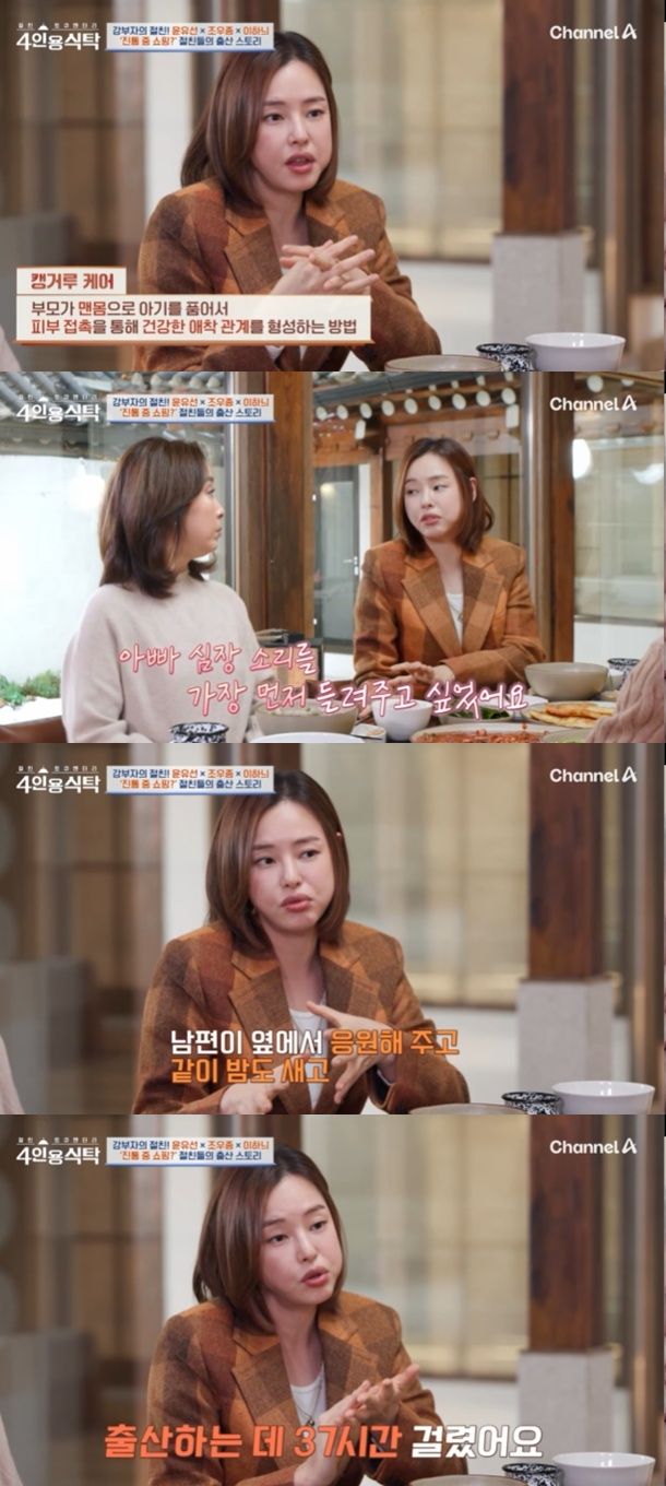 남편과 출산 과정을 공유했다는 그는 "(코로나19 시기여서) 조심스럽고 출입이 안 될 때였는데 캥거루 케어를 했다. 아빠 심장 소리를 들려줬으면 좋겠어서 남편이 탈의하고 가운 입고 들어갔다. 같이 낳은 거 같다. 남편이 옆에서 응원해 주고 밤을 새웠다. 37시간 걸렸다. 내가 순산할 상이어서 금방 낳을 줄 알았는데 아이가 위에 있어 안 내려가더라"라고 밝혔다.